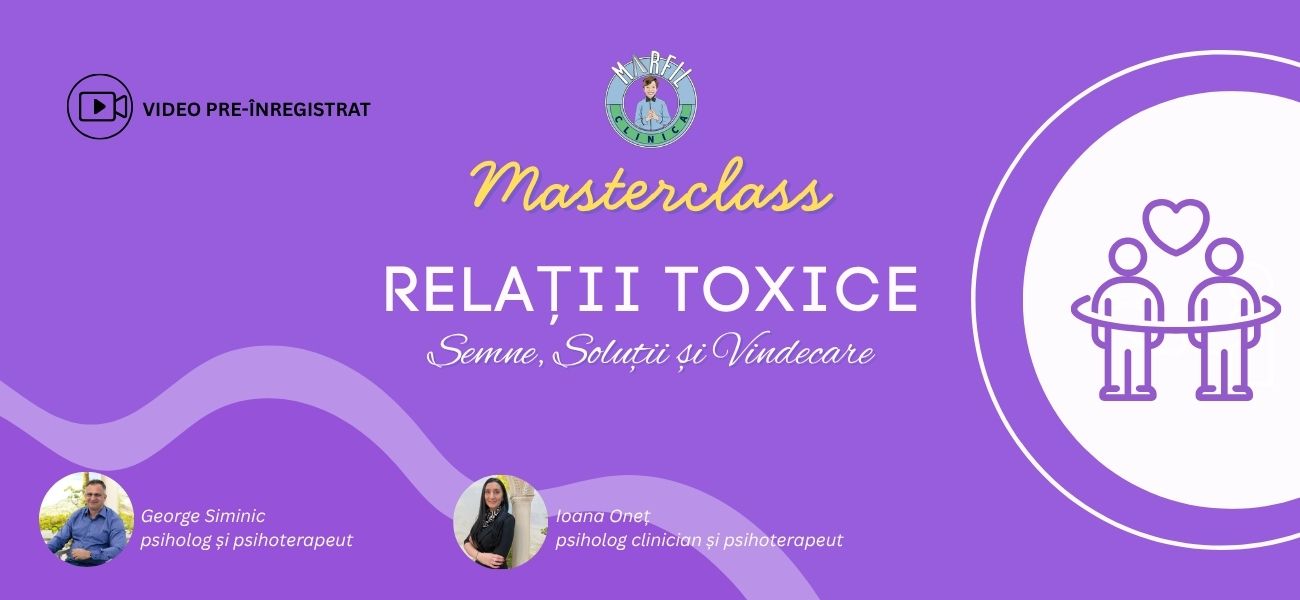 Acest masterclass, susținut de George Siminic și Ioana Oneț, psihoterapeut, te ajută să înțelegi mecanismele relațiilor toxice, să recunoști semnele de avertizare și să iei decizii care să-ți protejeze sănătatea emoțională. Vei învăța strategii psihologice concrete pentru a schimba dinamica relației, a-ți recăpăta echilibrul și a-ți construi relații sănătoase.